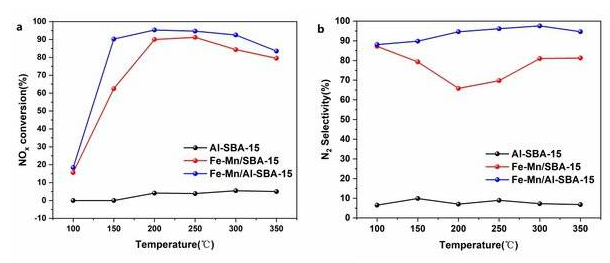 图2. Fe-Mn/SBA-15催化剂和Fe-Mn/Al-SBA-15催化剂的NH3-SCR脱硝活性结果. a NOx转化率.b N2选择性
